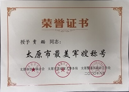 近日,太原市政集團(tuán)安裝公司辦公室主任賈璐被太原市婦女聯(lián)合會、太原市退役軍人事務(wù)所、太原警備區(qū)政治工作處評為“太原市最美軍嫂”。