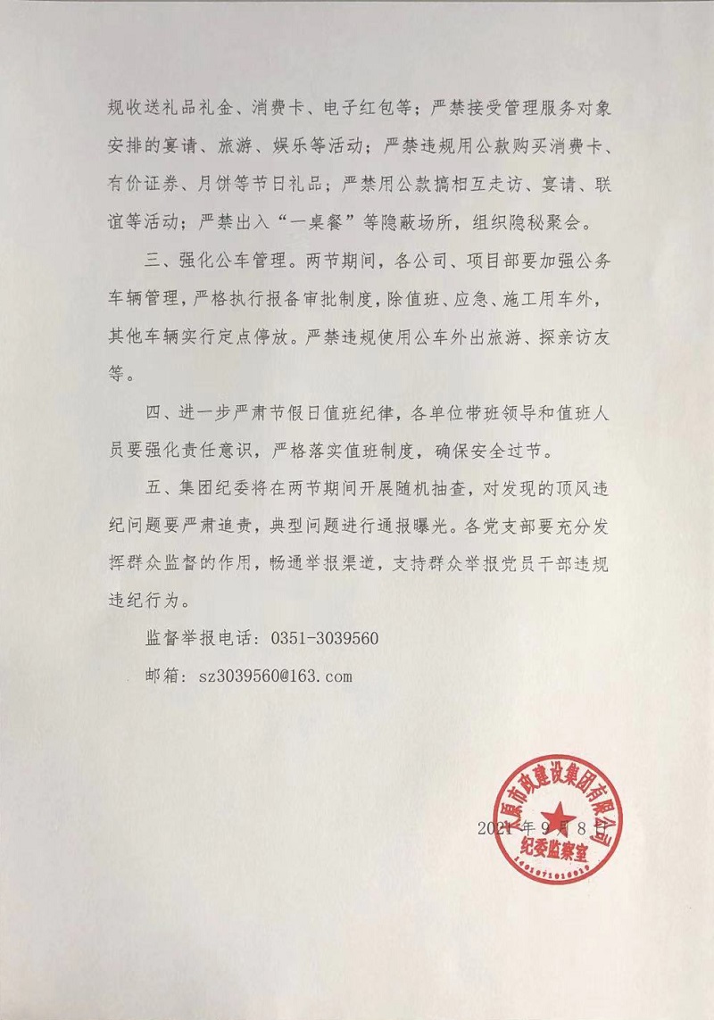太原市政建設(shè)集團(tuán)有限公司關(guān)于嚴(yán)明“中秋、國慶”期間有關(guān)紀(jì)律要求的通知