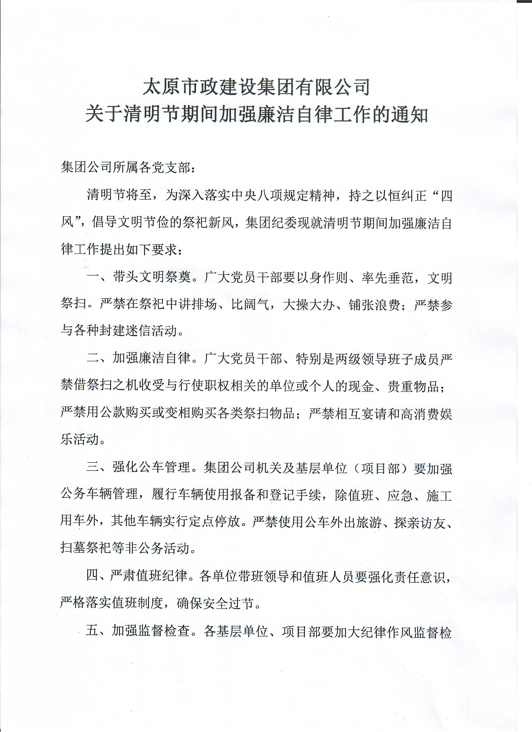 太原市政建設(shè)集團有限公司關(guān)于清明節(jié)期間廉潔自律工作的通知
