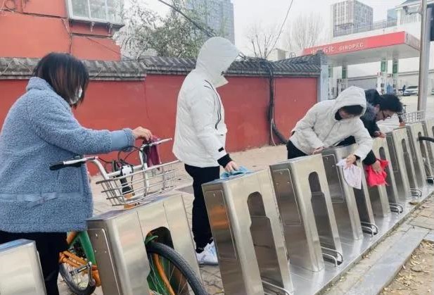 活動中,志愿者們對太原市第二十中學(xué)校門前的公交自行車停放點進(jìn)行了擦拭,并將車輛擺放整齊,以實際行動為美化城市貢獻(xiàn)力量。