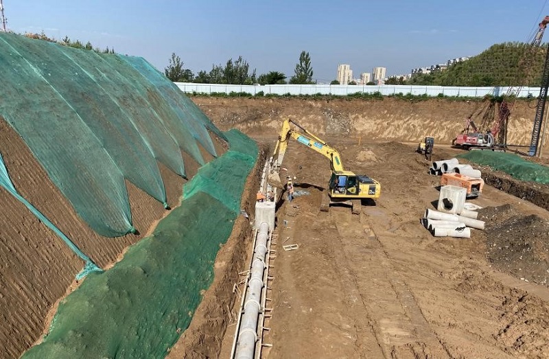 該工程雨污水管道、電力隧道的部分管線為深溝槽作業(yè),溝槽平均深度為4米,最深處達(dá)6米。同時(shí),該工程部分路段涉及挖方量大的情況,這些都增加了施工難度和危險(xiǎn)系數(shù)。項(xiàng)目部技術(shù)人員根據(jù)施工現(xiàn)場實(shí)際情況,共同研究應(yīng)對(duì)措施,制定了《深溝槽開挖專項(xiàng)方案》和《大挖方邊坡修整、支護(hù)方案》,采取了分級(jí)放坡開挖和邊支護(hù)邊開挖的方式,有效防止兩側(cè)土體的塌落;在挖方路塹施工時(shí),及時(shí)掛網(wǎng)噴漿,有效維護(hù)了邊坡穩(wěn)定;在開挖坡頂設(shè)置了截水溝,有效防止雨水的溝槽和邊坡的沖刷和浸泡,增加了施工的安全系數(shù),切實(shí)保證了在溝槽和路塹開挖段內(nèi)作業(yè)機(jī)械和人員的安全。