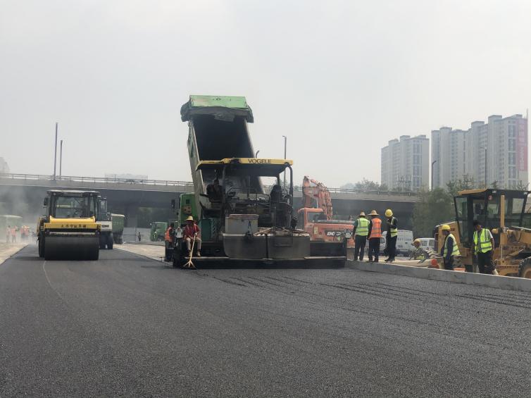 面對工期緊、任務重等情況,項目部不等不靠、見縫插針,緊抓一切施工有利時機,快速推進該工程東段道路下面層和中層瀝青混凝土鋪設作業(yè)。由于瀝青攤鋪施工受到雨水天氣、環(huán)保管理等因素影響,項目部結合實際組織施工,狠抓現(xiàn)場管理和過程控制,確保施工質(zhì)量、進度等各項工作處于時刻受控狀態(tài)。施工中,項目部超前部署、提前著手,調(diào)配攤鋪機、壓路機、運料車等機械,做好各項準備工作,并要求施工人員嚴格把關各道工序,協(xié)調(diào)推進攤鋪進展;施工人員緊盯現(xiàn)場,全程跟進攤鋪過程,確保整體攤鋪質(zhì)量。同時在該工程的西段施工現(xiàn)場,管線施工、路基平整、路側(cè)石砌筑等工序在作業(yè)面同時開展,有效壓縮工序間的銜接時間;在管線施工中,項目部重點部署溝槽回填施工,嚴格保障回填質(zhì)量達到規(guī)范要求。
