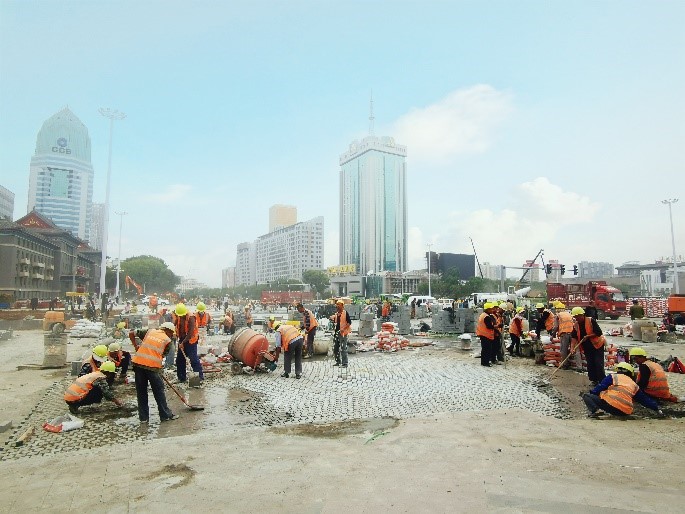 廣場南路段是目前施工最為忙碌的一個路段,花崗巖丁石砌筑、路面清理、廣場綠化、路側(cè)石安裝多道工序同時進行。道路一側(cè)工人們正在進行花崗巖丁石切割、鋪裝、灌縫、打磨,另一側(cè)路側(cè)石的安裝、砌筑也在同步作業(yè);園林綠化還在進行廣場的裝飾;叉車來回穿梭著運送石料、水泥,霧炮車在工地上不停降塵,灑水車正在對路面進行清洗,打磨機正在對花崗巖丁石進行打磨,全體施工人員上下一心,24小時奮戰(zhàn)在施工一線,以“鐵軍”的堅定意志,確保工程按期完工。