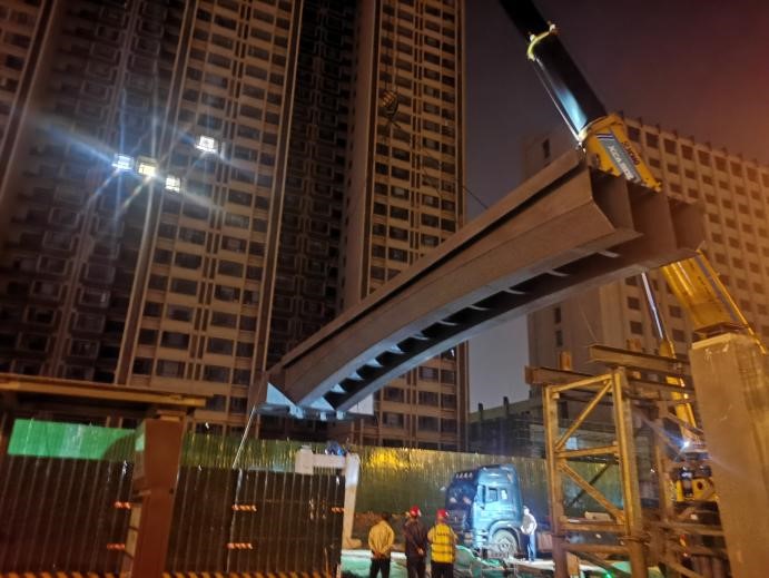 十項(xiàng)目部承建了北中環(huán)森林公園南門、濱河西路市圖書館北側(cè)、濱河西路三給街口共3座人行天橋。在北中環(huán)森林公園南門人行天橋的施工中,項(xiàng)目部結(jié)合橋梁跨度過大,北中環(huán)街車流量大等實(shí)際,組織全體參建人員加班加點(diǎn),24小時(shí)不停作業(yè),并合理安排夜間施工段進(jìn)行鋼箱梁吊裝工作。吊裝過程中,施工人員緊盯現(xiàn)場(chǎng),嚴(yán)格控制主橋軸線位置漂移量及臨時(shí)支架的搭設(shè)高度,保證每段鋼箱梁焊縫按規(guī)范要求進(jìn)行。同時(shí),在封路期間項(xiàng)目部提前與周邊小區(qū)物業(yè)進(jìn)行溝通,并安排專人在現(xiàn)場(chǎng)進(jìn)行疏導(dǎo),保證施工安全順利實(shí)施,用時(shí)3個(gè)晚上完成鋼箱梁吊裝工作,盡量減小對(duì)周邊居民的出行影響。截至目前,北中環(huán)森林公園南門人行天橋、濱河西路市圖書館北側(cè)人行天橋、濱河西路三給街口人行天橋主橋鋼箱梁已全部吊裝完成。三座天橋正在進(jìn)行主橋鋼箱梁焊接及梯坡道吊裝、護(hù)欄安裝、橋面鋪裝,恢復(fù)非機(jī)動(dòng)車道路面及人行道結(jié)構(gòu)等工作。