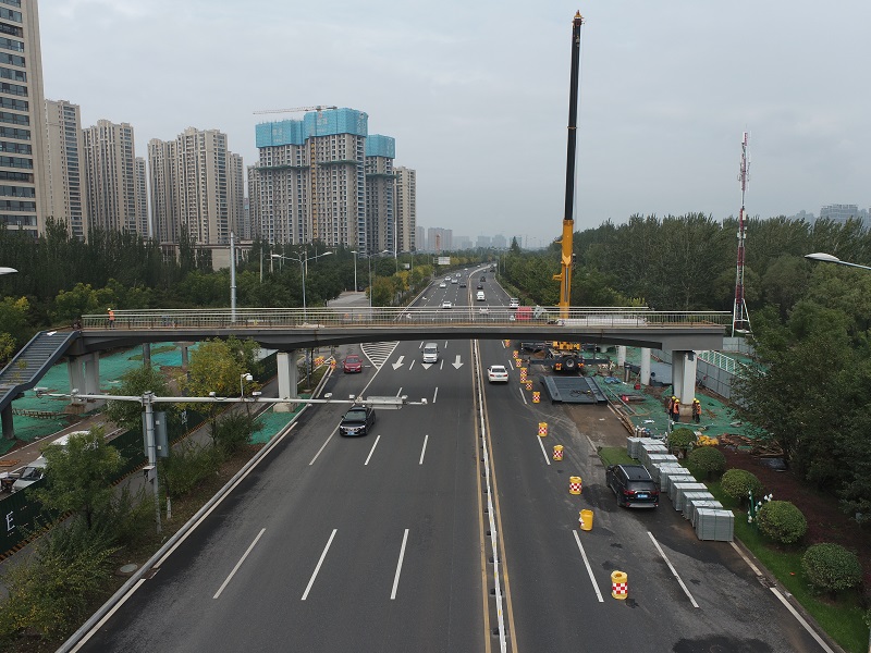 十項目部承建的北中環(huán)森林公園人行天橋主橋長度為93.8米,必須進(jìn)行分段吊裝。10月8日,項目部協(xié)調(diào)多臺500噸吊車進(jìn)場,在不影響車輛正常通行的情況下,利用夜間時間加緊進(jìn)行吊裝。同時,因時間緊,任務(wù)重,在灌注樁施工中,項目部全體參建人員精心配合、各司其職,人材機(jī)各方面緊密配合,確保按計劃時間節(jié)點完成每日工作量,為日后主橋吊裝作業(yè)節(jié)省出更多寶貴時間。截至目前,承建的三座人行天橋鋼箱梁主體結(jié)構(gòu)已全部完成。北中環(huán)森林公園南門人行天橋兩側(cè)欄桿安裝和主橋大理石鋪裝已完成,正在進(jìn)行南北兩側(cè)梯道坡道欄桿安裝和大理石鋪裝;濱河西路市圖書館北側(cè)人行天橋西側(cè)坡道吊裝已完成,下一步將進(jìn)行東側(cè)坡道吊裝、橋面鋪裝及護(hù)欄安裝;濱河西路三給街口人行天橋兩側(cè)梯坡道已吊裝完成,下一步將進(jìn)行梯坡道安裝和主橋大理石鋪裝。