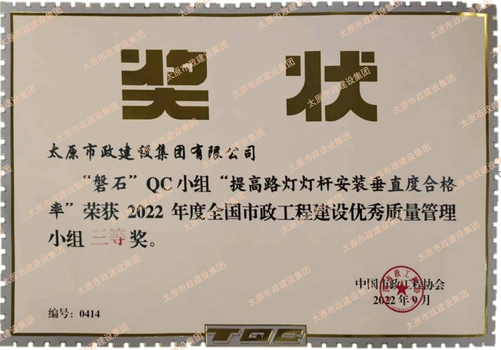 集團(tuán)公司申報的“磐石”QC小組“提高路燈燈桿安裝垂直度合格率”、“核動力”QC小組“提高瀝青路面壓實度合格率”榮獲2022年度全國市政工程建設(shè)優(yōu)秀質(zhì)量管理小組三等獎。