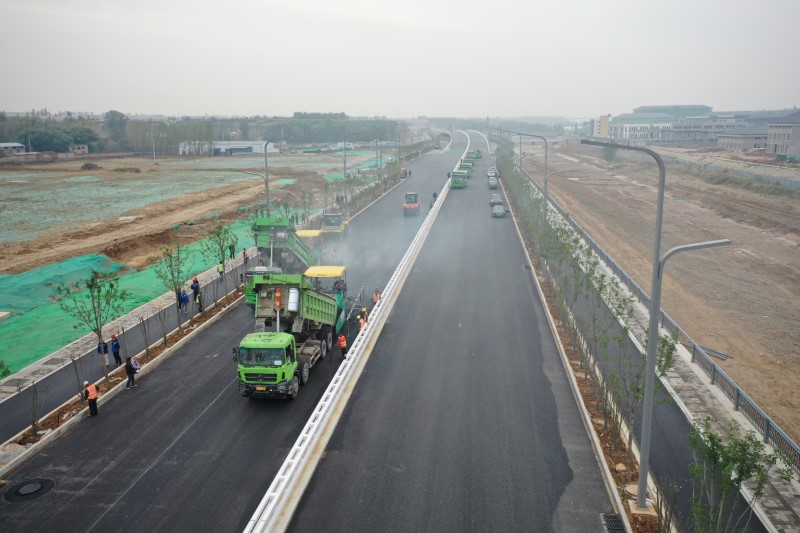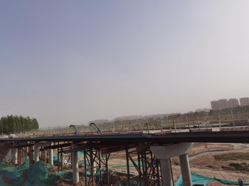 濱河?xùn)|路南延二期工程施工一標(biāo)段北起迎賓路,南至設(shè)計樁號K5+500,道路全長約5.3公里,設(shè)計紅線寬為51.5-60米,施工內(nèi)容包括人行地下通道、排水、電力、下穿通道、高架橋、道路工程,于2021年12月開工建設(shè),由一公司、三公司共同承建。該工程作為市重點項目,一公司強(qiáng)效組織、積極籌劃,確立“精心組織、精準(zhǔn)對標(biāo)、精細(xì)管理、精致施工”的理念,采取“分段管理”的施工方案,確立七個工區(qū),并安排專人負(fù)責(zé)各工段,形成全面開花、相互協(xié)作的工作局面,大力提高施工效率。施工中,項目部錨定目標(biāo)節(jié)點,制定施工計劃,冬季施工中認(rèn)真做好混凝土養(yǎng)護(hù)和保溫工作,有效防止混凝土凍裂;采用放坡和拉森鋼板樁+鋼支撐的支護(hù)方式,嚴(yán)格控制鋪筑厚度逐層回填夯實,為施工奠定堅實基礎(chǔ);合理調(diào)配110臺機(jī)械、854名施工人員24小時倒班不間斷作業(yè),最快一天連續(xù)鋪筑瀝青混凝土1800米,掀起“大干不停歇”的施工熱潮。2022年9月,一公司圓滿完成全部施工任務(wù),在全線七個標(biāo)段中名列前茅,為汾河?xùn)|岸再填一條平坦大道。三公司全體參建人員與時間賽跑,從各施工區(qū)域土方工程破土動工,到墩柱、橋梁相繼“沖出”地平線,爭時間、搶進(jìn)度,是該工程第一個完成首聯(lián)箱梁澆筑的標(biāo)段。其中,橋梁工程是整個工程的重中之重,結(jié)合工程自身特點,現(xiàn)澆箱梁采用滿堂紅盤扣式支架法進(jìn)行施工,大大提高了模板安裝精度和施工質(zhì)量,降低了模板、腳手架的安裝難度;項目部嚴(yán)格把控瀝青混凝土鋪設(shè)這最為關(guān)鍵的一步,攤鋪機(jī)勻速前進(jìn),刮平后立即檢查,及時進(jìn)行人工充分壓實。項目部肩負(fù)光榮使命,齊心協(xié)力戰(zhàn)疫情、斗風(fēng)沙、頂驕陽、冒暴雨,及時排除項目建設(shè)過程中難點、堵點問題,以腳踏實地的努力,保證了一個個節(jié)點目標(biāo)的如期完成,確保施工進(jìn)程“不歇步”,合力攻堅、全速推進(jìn),用敬業(yè)和擔(dān)當(dāng)詮釋了實干精神,彰顯了市政人“闖”的精神,“創(chuàng)”的勁頭。