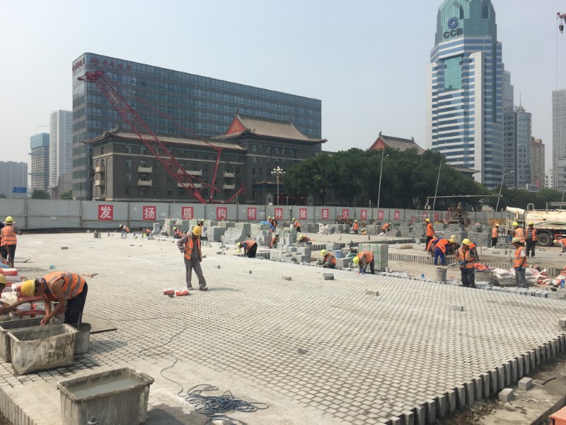 太原市五一廣場改造工程市政道路及管網(wǎng)工程包括環(huán)五一廣場一周的廣場西路、廣場環(huán)路、廣場東路、廣場南路、迎澤南街、并州北路及廣場范圍內(nèi)迎澤大街段道路改造,道路全長1.267公里,于2021年4月開工建設(shè),由二公司負(fù)責(zé)承建。該工程經(jīng)歷了近6個月的日夜鏖戰(zhàn),于2021年10月1日圓滿完成了廣場周邊7條道路共35165平方米的道路建設(shè)任務(wù),在集團(tuán)公司施工史上創(chuàng)造了兩個“第一次”。其中,扇形花崗巖丁石鋪裝在集團(tuán)公司施工中實屬首次,整個路面是由10厘米×10厘米×30厘米的花崗巖丁石鋪設(shè)而成。整個路面鋪筑由扇形面和方形面組成,整個工程扇形鋪裝面積達(dá)到19382平方米,而一個扇形面需要88塊花崗巖丁石,且其中有18塊需要進(jìn)行切割,一個扇形面鋪裝需要經(jīng)過測量放樣、丁石試拼、切割等十幾道工序,且在花崗巖丁石下側(cè)采用了總厚度達(dá)0.98米的道路結(jié)構(gòu)層,極大程度上確保了鋪裝結(jié)構(gòu)的穩(wěn)定性和平整性。同時,為確保工程順利完工,項目部投入大量的人力資源,并優(yōu)先選用工作細(xì)致、水平較高、技術(shù)熟練的施工隊伍,確保項目鋪裝進(jìn)度和質(zhì)量。項目部每天在1.1萬平方米的施工場地上投入250余名民建隊員進(jìn)行花崗巖丁石鋪裝,同時每個隊伍按照放線-切割-安裝-灌漿-打磨的施工細(xì)節(jié),實行“小團(tuán)隊—流水線”作業(yè),確保了扇形面積的鋪裝進(jìn)度和質(zhì)量。在當(dāng)時工程即將完工之際,二公司更是從各項目部抽調(diào)技術(shù)骨干和民建隊員,全部投入到廣場最后沖刺,最終實現(xiàn)了五一廣場周邊道路的順利通車。