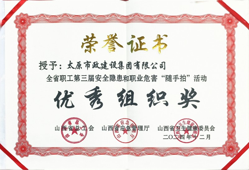 太原市政集團被山西省總工會、山西省應急廳、山西省衛(wèi)生健康委員會授予全省職工第三屆安全隱患和職業(yè)危害“隨手拍”活動優(yōu)秀組織獎,其中三名職工的“隨手拍”作品獲得優(yōu)秀獎。