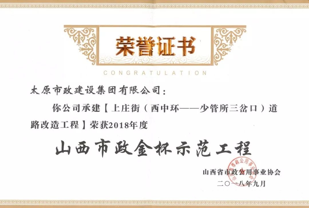 9月20日,太原市政建設(shè)集團有限公司承建的太茅路改造工程三標(biāo)段、陽泉市污水處理廠二期工程、上莊街(西中環(huán)——少管所三岔口)道路改造工程、太茅路(康寧街——迎賓路)改造工程二標(biāo)段榮獲山西省市政公用事業(yè)協(xié)會頒發(fā)的2018年度“山西市政金杯示范工程”榮譽稱號。
