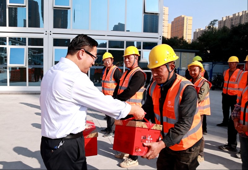活動中,市總工會領(lǐng)導與一線施工人員進行了親切交談,仔細詢問項目進展和員工生活保障情況,并為大家送來了月餅、豬肉等慰問品。