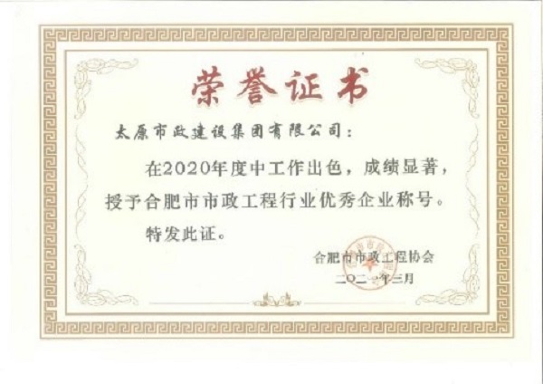 3月,集團(tuán)公司榮獲合肥市市政工程協(xié)會(huì)頒發(fā)的2020年度“合肥市市政工程行業(yè)優(yōu)秀企業(yè)”榮譽(yù)稱號。張晉虎、王東根榮獲2020年度“合肥市市政工程行業(yè)優(yōu)秀項(xiàng)目經(jīng)理”榮譽(yù)稱號。