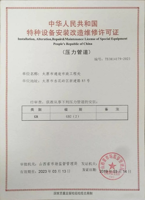 通途市政工程處喜獲山西省市場監(jiān)督管理局頒發(fā)的中華人民共和國特種設備安裝改造維修許可證