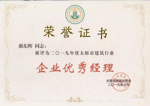 集團(tuán)公司黨委書(shū)記、董事長(zhǎng)郝東輝榮獲“2019年度太原市建筑行業(yè)企業(yè)優(yōu)秀經(jīng)理”榮譽(yù)稱(chēng)號(hào)。