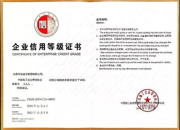 太原市政建設(shè)集團(tuán)有限公司榮獲“企業(yè)信用評(píng)價(jià)AAA級(jí)信用企業(yè)”榮譽(yù)稱號(hào)