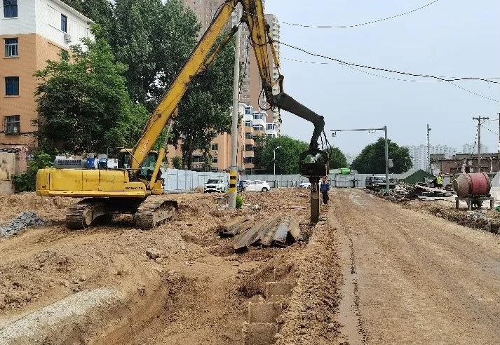 除迎新街北段外,其他道路在溝槽開挖時(shí),都需要在施工過程中對(duì)老舊居民樓進(jìn)行保護(hù)。項(xiàng)目部經(jīng)過仔細(xì)研究后,決定在建筑物旁采用兩排高壓旋噴樁進(jìn)行隔離保護(hù),減少施工對(duì)老舊建筑物的影響,確保工程安全。面對(duì)地下管線復(fù)雜的情況,項(xiàng)目部積極聯(lián)系業(yè)主,多次與煤氣、自來水、供熱等公司溝通協(xié)調(diào),最終對(duì)影響施工的管線進(jìn)行改遷,為工程順利施工奠定了基礎(chǔ)。同時(shí),迎新西一條施工范圍內(nèi)有十余根高壓電線桿,緊鄰雨污水管,因電線桿短期內(nèi)無(wú)法遷移,若進(jìn)行溝槽開挖,存在極大安全隱患,為確保施工安全,項(xiàng)目部采用打鋼板樁的方式對(duì)電線桿進(jìn)行保護(hù),順利解決了施工難題。