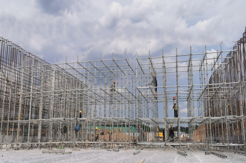 支架搭設(shè)提質(zhì)量 該工程在由東向西下穿東山過境高速公路的施工中,設(shè)計有1座長65米、寬33米、高8米,單孔跨徑為18米的四孔通道箱涵。依據(jù)國家相關(guān)規(guī)定,該通道施工屬于超過一定規(guī)模且危險性較大的分部分項工程,需要組織專家對施工方案進行論證。項目部提前謀劃,開工伊始責成相關(guān)技術(shù)人員制定專項方案,在六月中旬順利通過了專家論證,為后續(xù)施工奠定了堅實基礎(chǔ)。針對該通道墻板厚、荷載大、支模架搭設(shè)跨度寬的情況,項目部按照規(guī)定要求,決定采用組裝快捷、使用方便、節(jié)省費用、安全性達標的盤扣式鋼管支架進行打設(shè),確保高支模混凝土澆筑安全穩(wěn)定,有效保證了頂板支架搭設(shè)的施工安全。