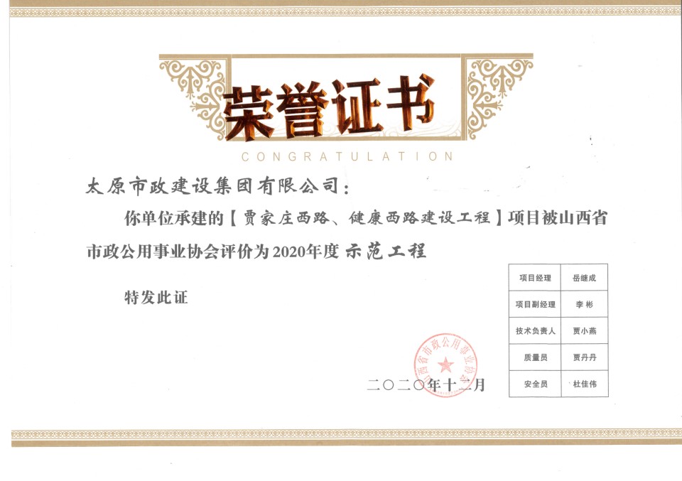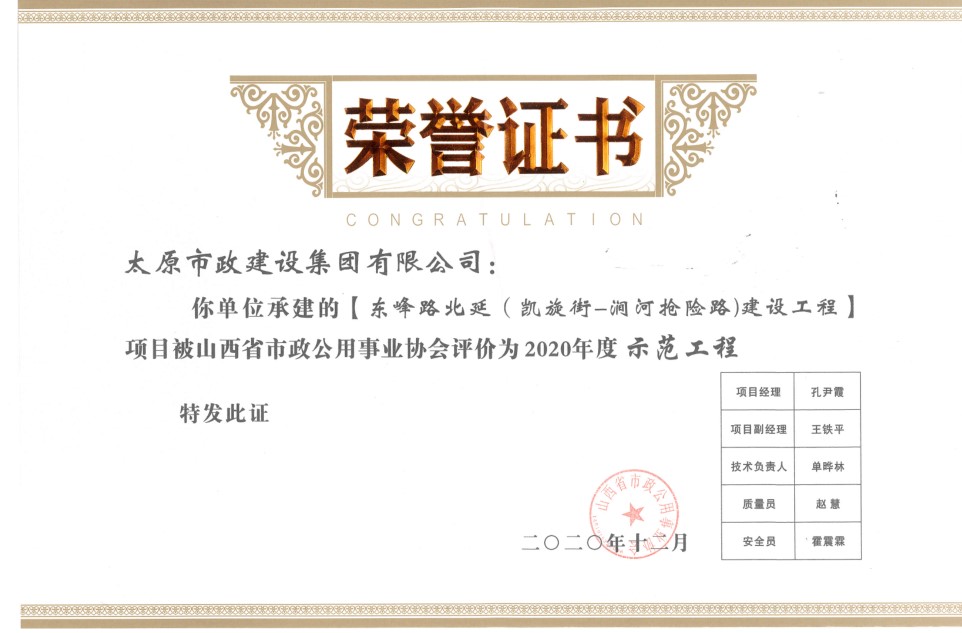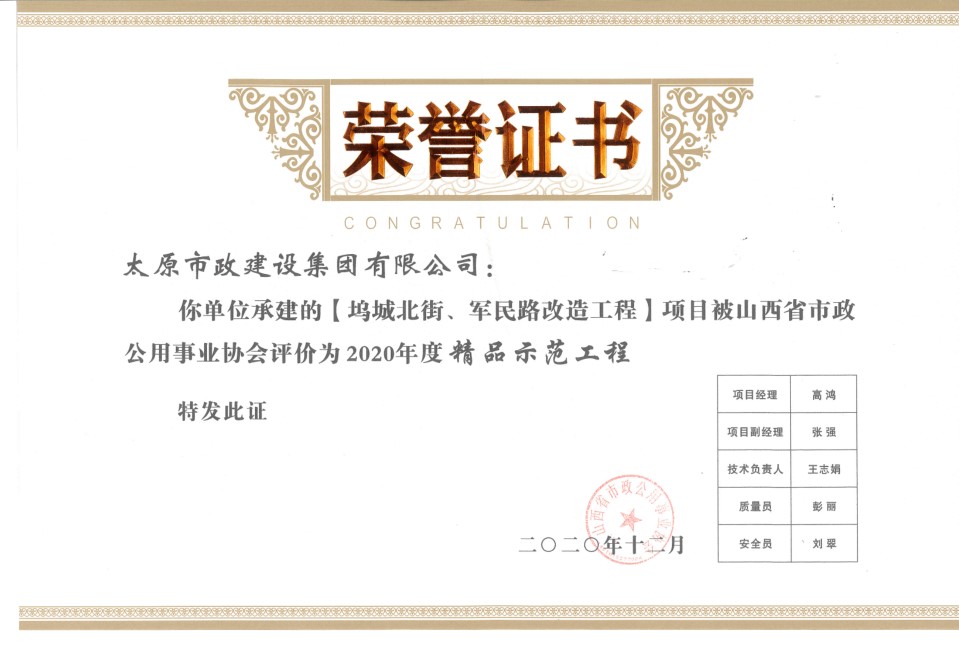 近日,集團公司承建的塢城北街、軍民路改造工程被山西省市政公用事業(yè)協(xié)會評為“2020年度精品示范工程”,東峰路北延(凱旋街—澗河搶險路)建設(shè)工程,賈家莊西路、健康西路建設(shè)工程被山西省市政公用事業(yè)協(xié)會評為“2020年度示范工程”。同時,高鴻、孔尹霞在2020年度山西省市政公用事業(yè)協(xié)會市政工程項目經(jīng)理評價活動中被評為“優(yōu)秀項目經(jīng)理”。